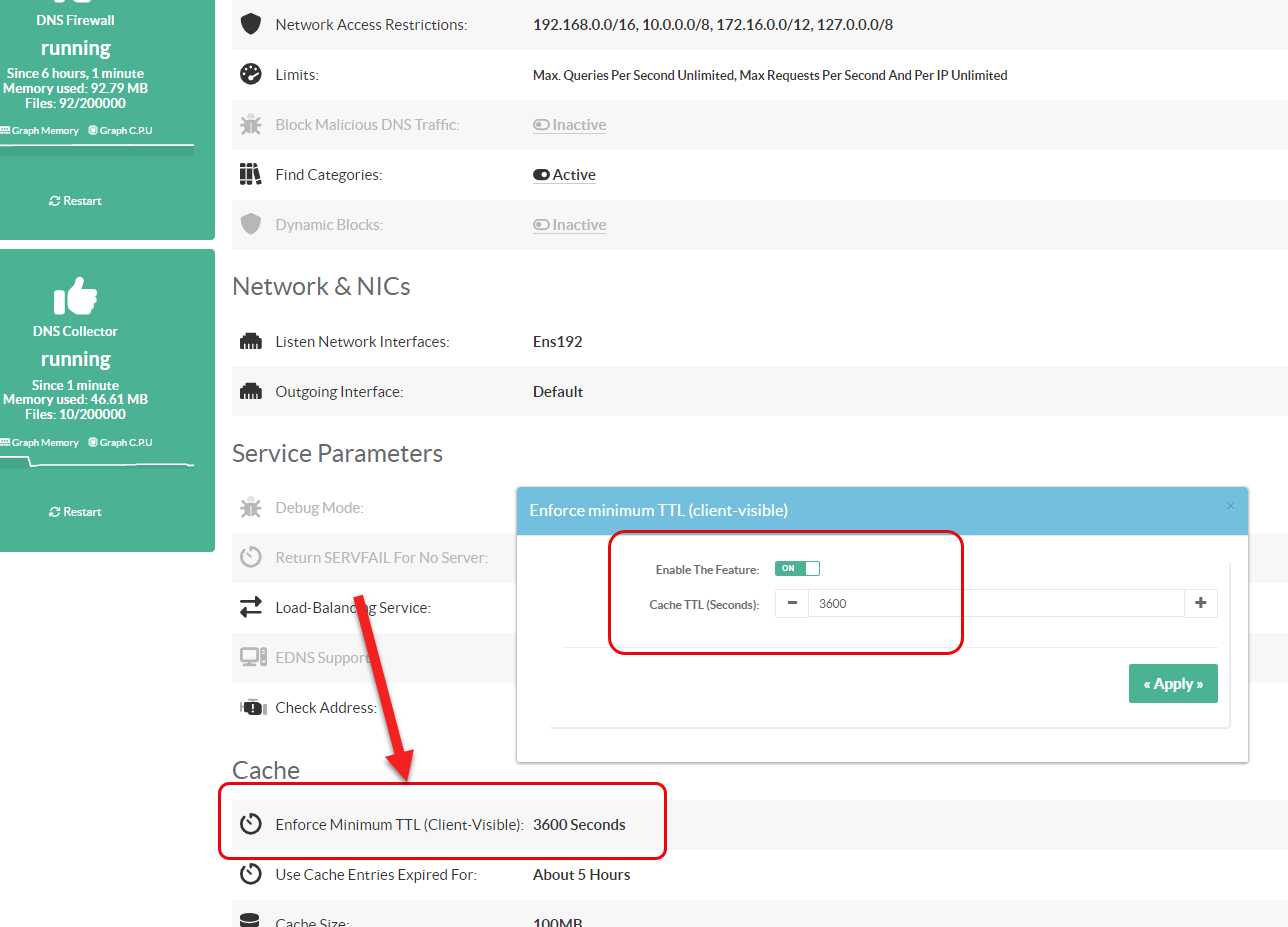 Ensure every DNS answer sent to clients has a TTL of at least a defined number of seconds, regardless of the upstream TTL or what’s stored in cache. When enabled, the DNS service rewrites low TTLs on the fly (both normal responses and cache hits) so clients will cache results for at least the defined time.