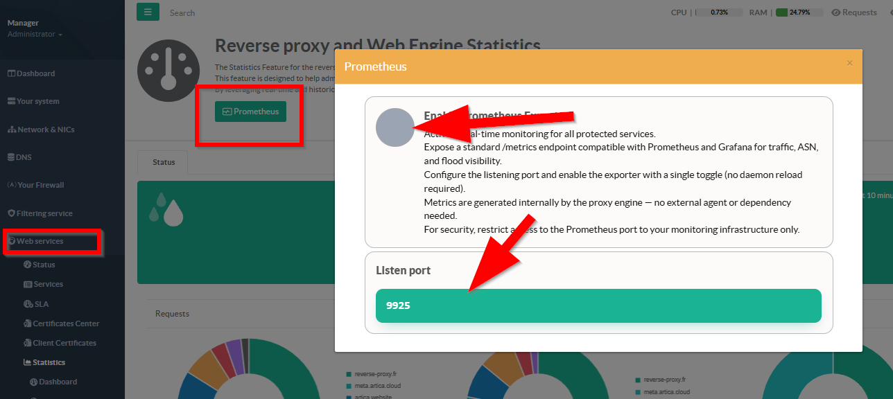 The Artica Reverse Proxy exposes a built-in Prometheus-compatible metrics endpoint on port 9925, providing real-time visibility into reverse proxy traffic, security posture, and flood mitigation effectiveness across all protected services.