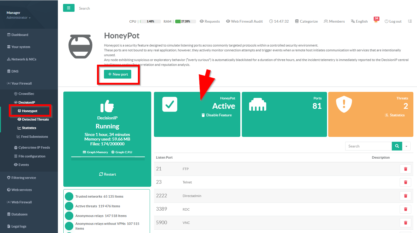 Honeypot is a security feature designed to simulate listening ports across commonly targeted protocols within a controlled security environment.