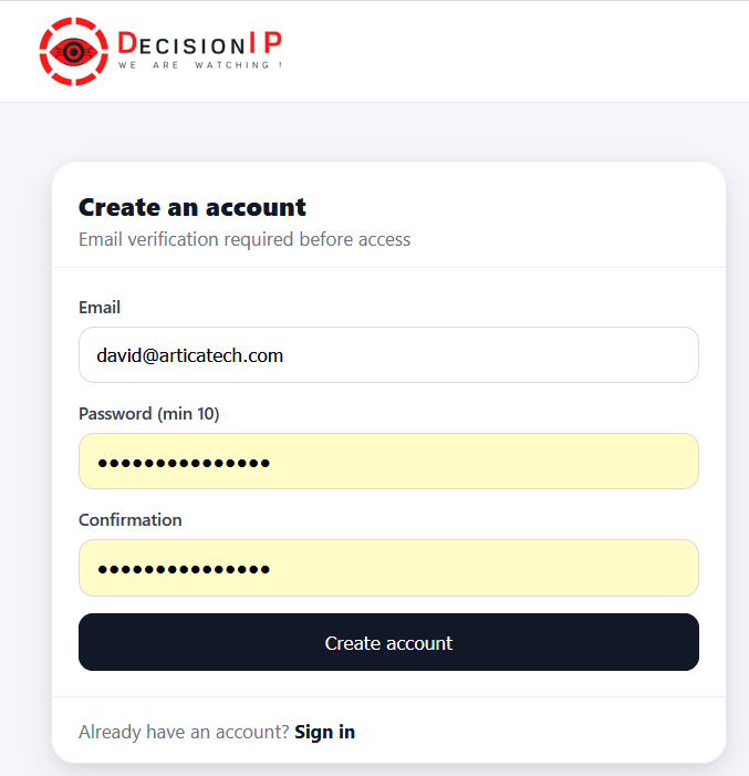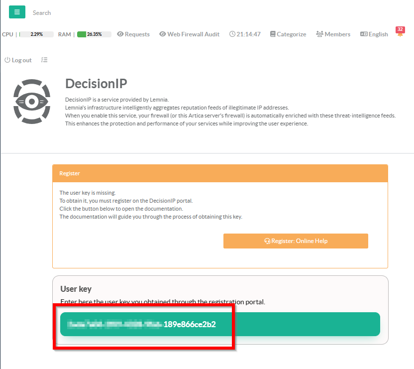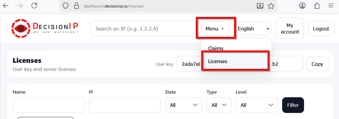 To retrieve your user key, you must register on the DecisionIP portal.