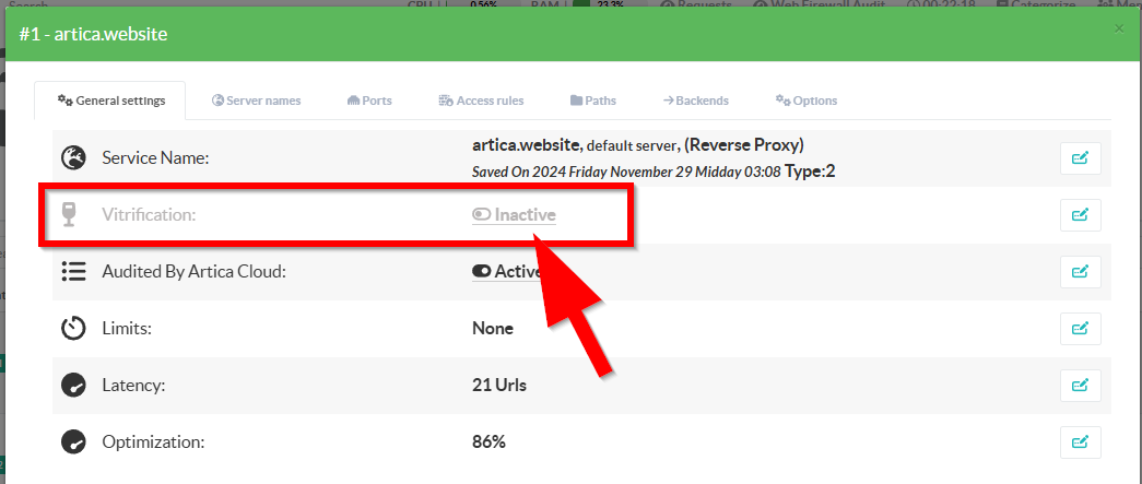 Auto Switch: Artica is responsible for regularly testing the health and performance of backend servers. It measures their latency to evaluate operational stability. If the calculated latency exceeds the configured threshold, vitrification mode is automatically activated, and the reverse proxy switches to serving the local static HTML copy.
