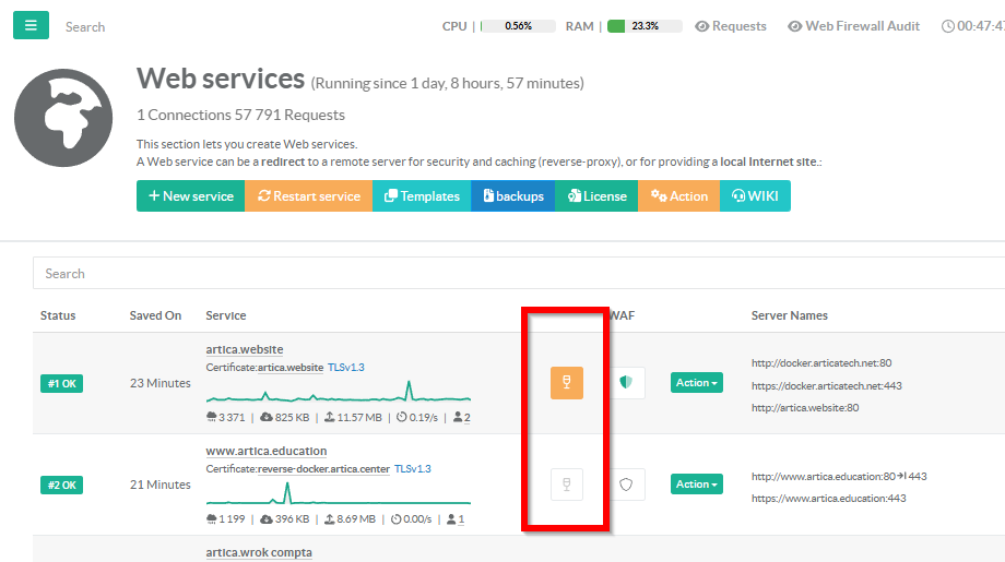 In the main table, to the left of the WAF column, a glass icon indicates whether the site has the vitrification feature enabled.