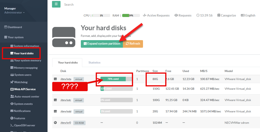 However, a new Expand system partition button is displayed, indicating that Artica has detected the system partition should be extended.