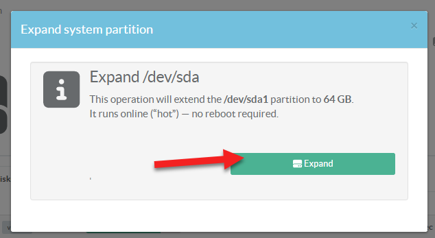 Warning: this method works only if your system disk has a single partition. If you have two partitions (e.g., /dev/sda1 and /dev/sda2) as in the example below, you won’t be able to extend it with this tool; you’ll need to perform the extension manually or via a Live CD.