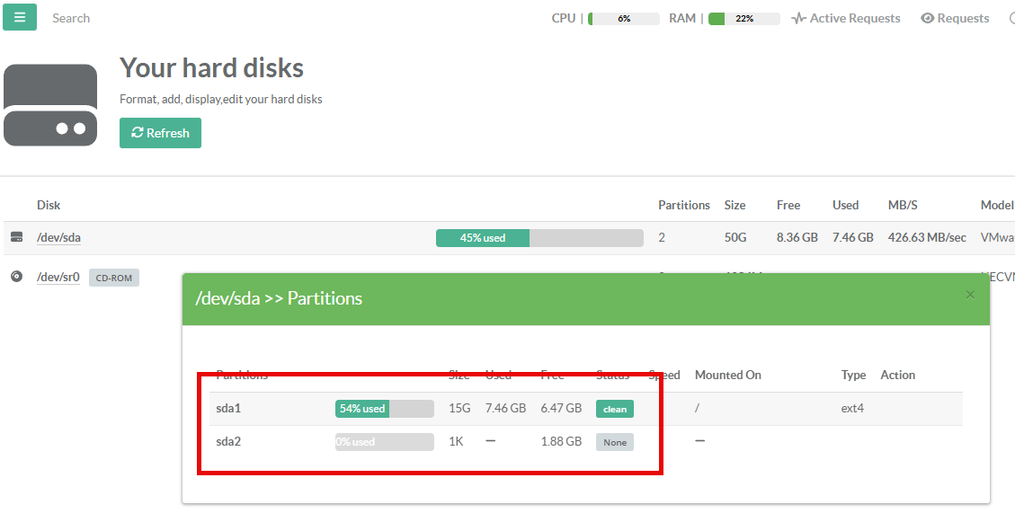 You’ll notice an inconsistency: although the disk now shows the updated size, utilization remains high. This is because Artica sees the physical disk size but still maps it to your current partition sizes.