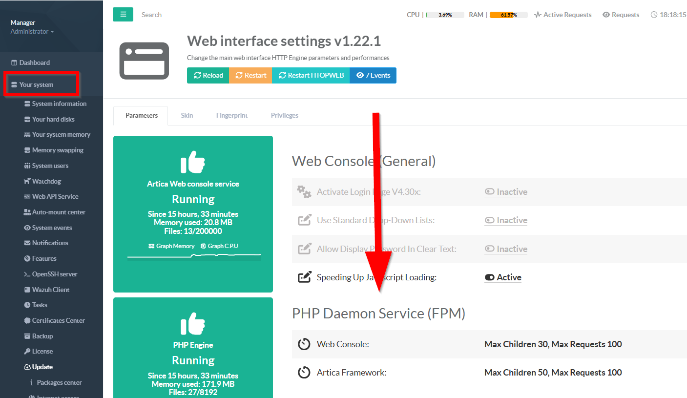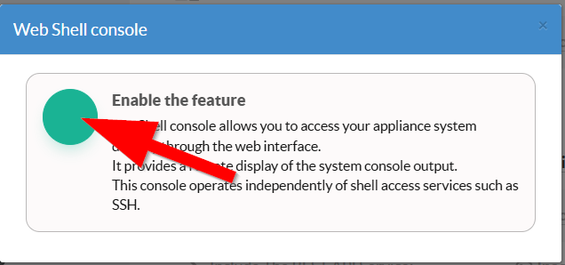 If you want to disable shell access through the web console, follow these steps. This feature is available on Artica v4.50 Service Pack 7 or Artica v4.50 Service Pack 6 Hotfix 20260317-19